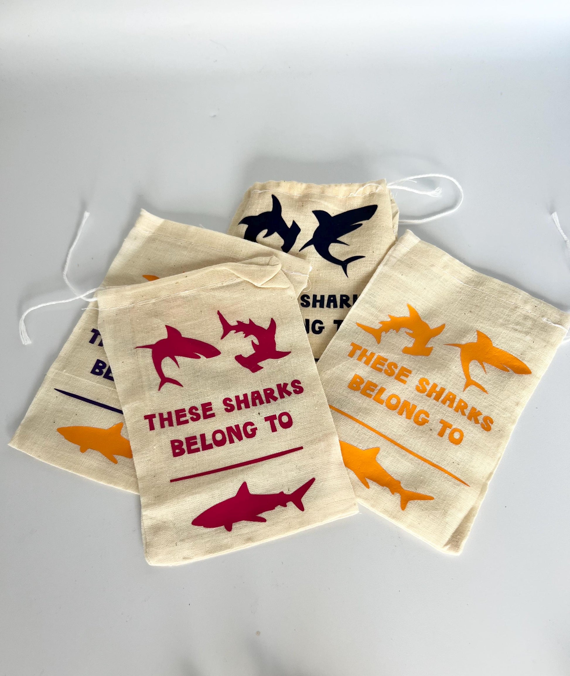 1 x Reusable cotton pouch with “These Sharks Belong To…...” printed, ready to personalise. Colour of the bag will be selected at random. Bag size is 13cm x 9cm