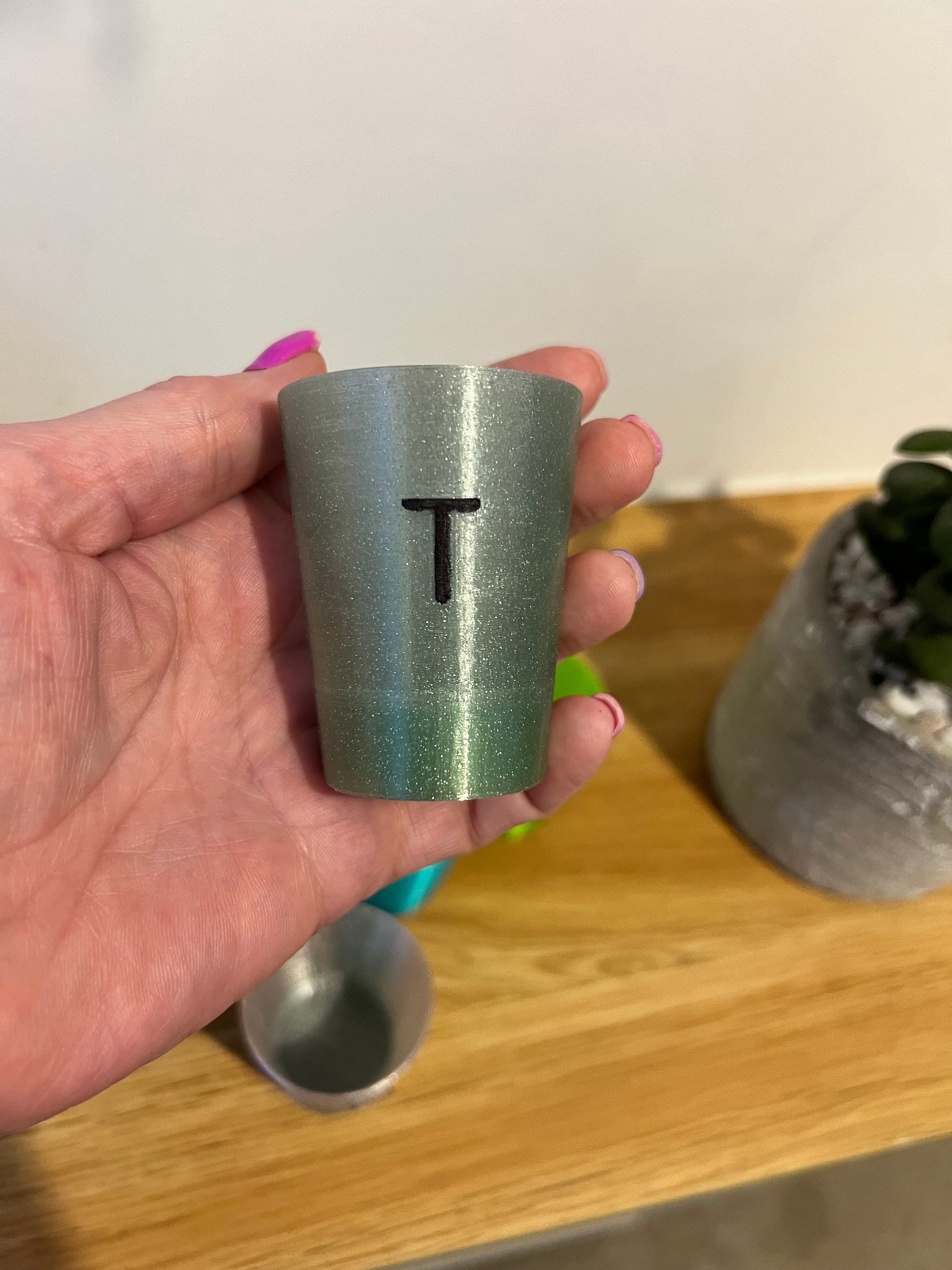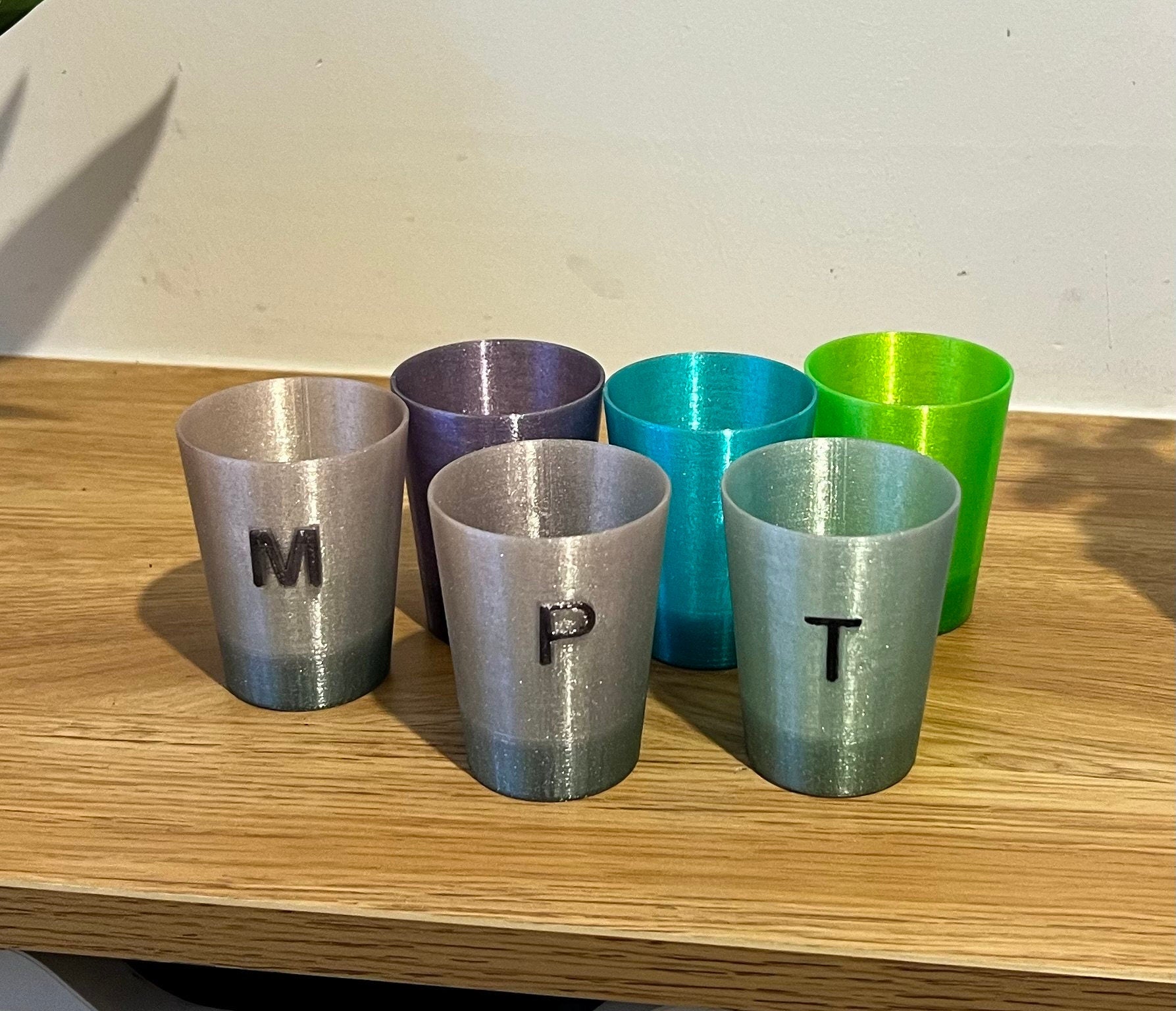 Personalised mini mouth wash glasses. No more worries about other people drinking from the mouthwash cap or bottle, now everyone can have their own little cup just for mouthwash.