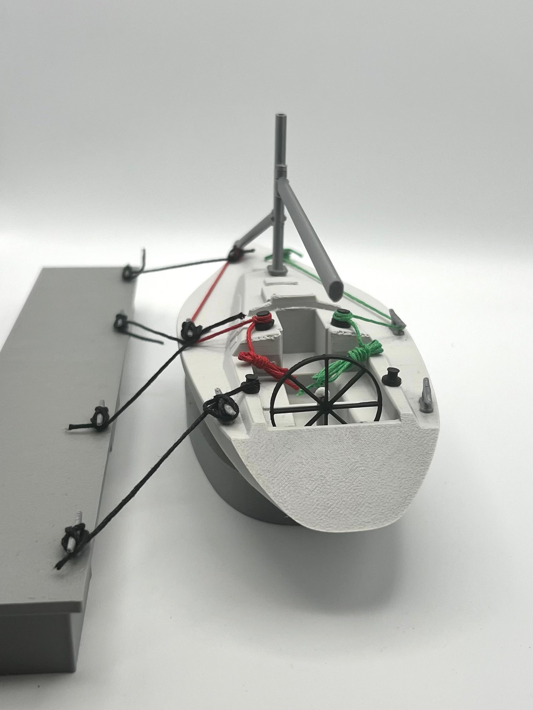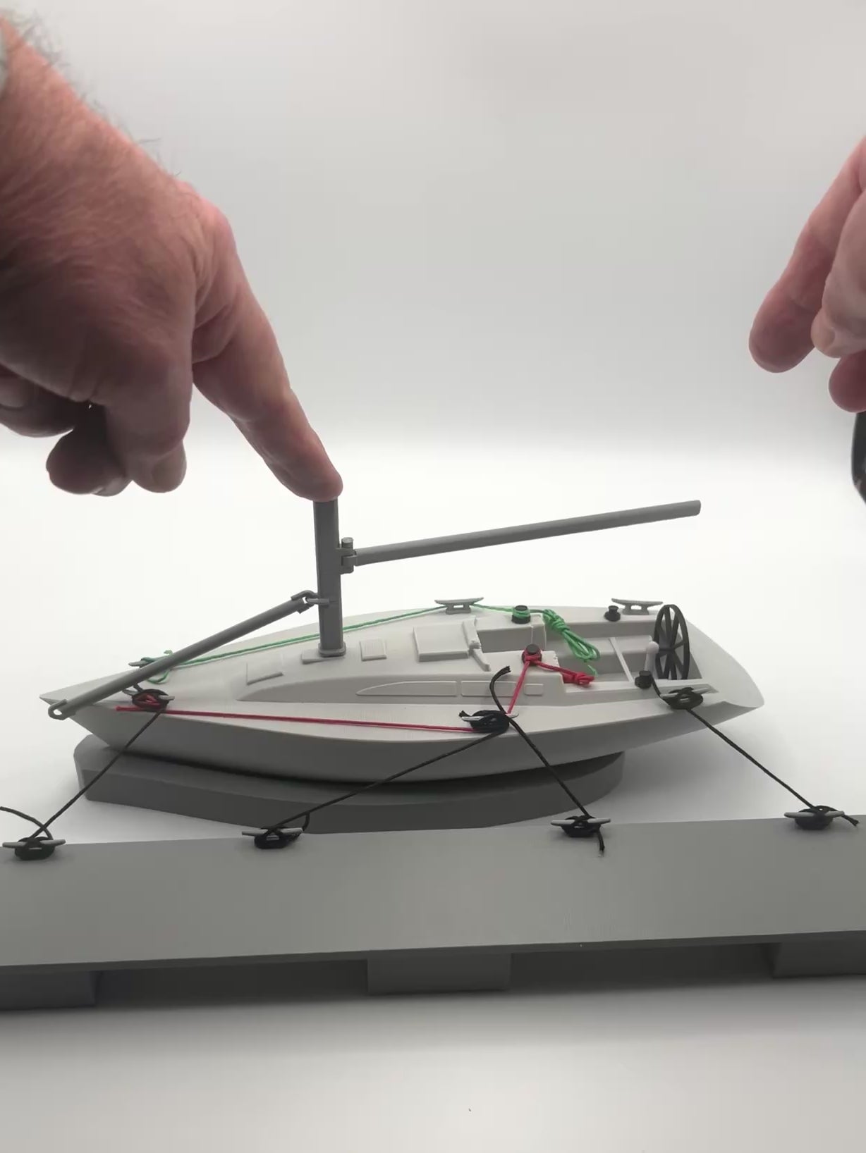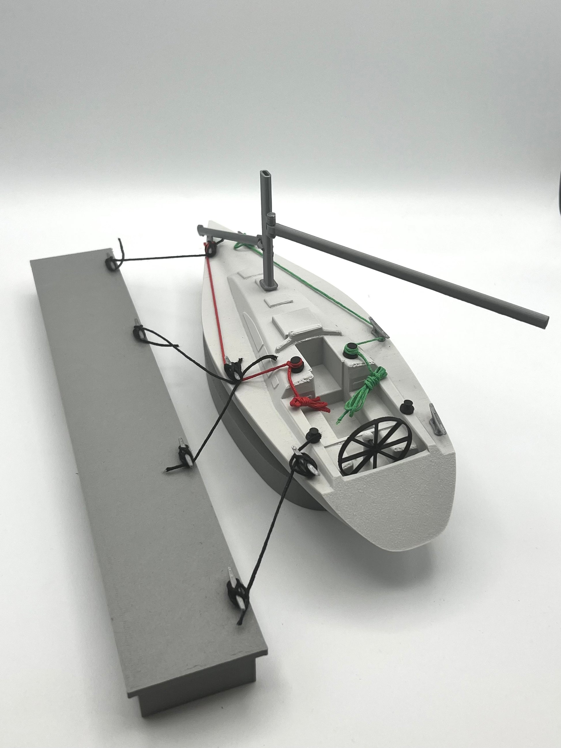 Yacht instruction aid, this model yacht comes with a model pontoon with functional cleats, lines, moving boom and spinaker pole, ideal for various types of sailing training. Excellent tool for explaining spring lines etc.